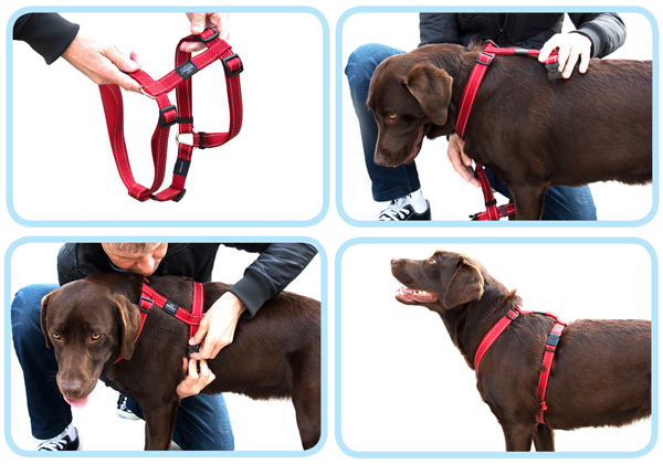 It's as simple as putting it over your dog's head and "click", easy peasy. Your dog will happily sit, stand, and sometimes lie down ready to get its harness on.